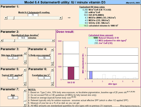 The fundamental basis of this meter's calibration seeks to equate 1 minimal erythemal dose (MED) with 1000 IU of Vitamin D3 for skin type 2 at 10% body exposure (face and lower arms) with no base tan or SPF at age 20 average young adult. Interactive excel spreadsheet "utility" software will be provided with each meter to adjust the above parameters and dose duration based on your personal metrics. See screen shot of this utility below: